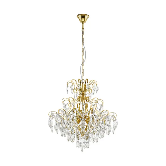 Модель 39605 выполнена в классическом стиле и имеет форму круга, материал декора - хрусталь, пердназначена для установки в гостинной. Степень защиты модели - IP20. Площадь освещения - до 15 м2. Плафон у модели декоративный. Арматура выполнена в золотом цвете, сделана из металла. Способ крепления EGLO 39605 - на крюк, устанавливается на потолок.