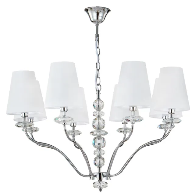 Модель ARMANDO SP8 CHROME выполнена в современном стиле и имеет форму круга, материал декора - хрусталь, пердназначена для установки в больших залах. Степень защиты модели - IP20. Плафон у модели белого цвета, конусной формы и выполнен из ткани. Арматура выполнена в цвете хром, сделана из металла. Способ крепления Crystal Lux ARMANDO SP8 CHROME - на крюк, устанавливается на потолок.